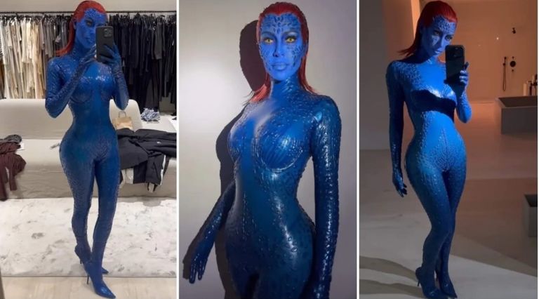 تألقت نجمة تلفزيون الواقع كيم كارداشيان في زي أزرق يجسد شخصية أحد أبطال X-Men's Mystique خلال احتفالها بعيد الهالوين.