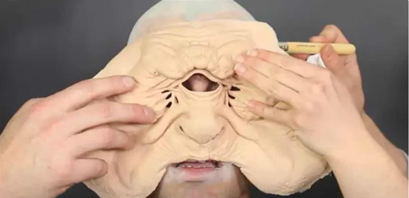 وأظهر المقطع أحدهم وهو يغيير ملامح شخص آخر ليبدو مرعباً بالاستعانة بقناع وتقنيات متقدمة في المكياج.