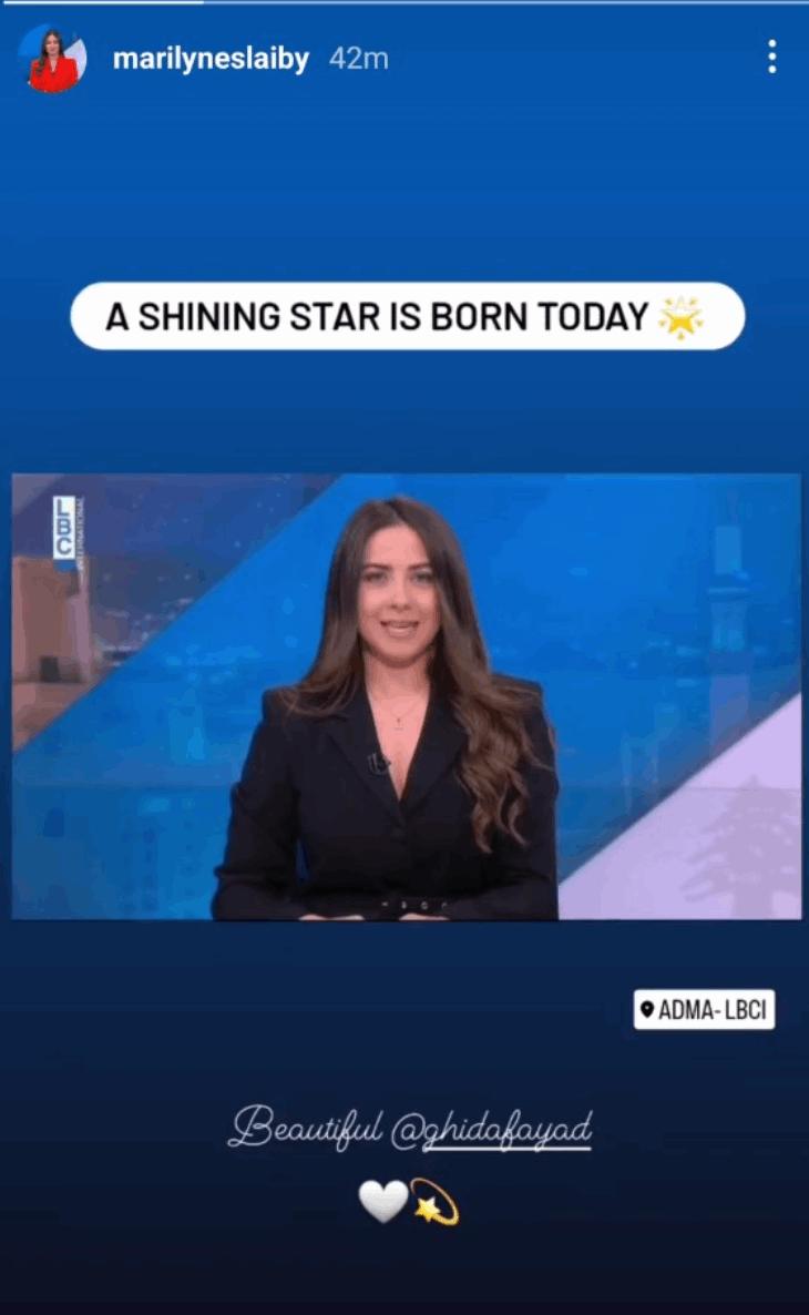 وبارك عدد من زملائها لها ومن بينهم زميلتها ماريلين صليبي التي هنأتها على إطلالتها الأولى وقد نشرت صورتها على خاصية "الستوري" على حسابها الخاص على انستغرام وعلقت عليها قائلة: "اليوم ولدت نجمة".