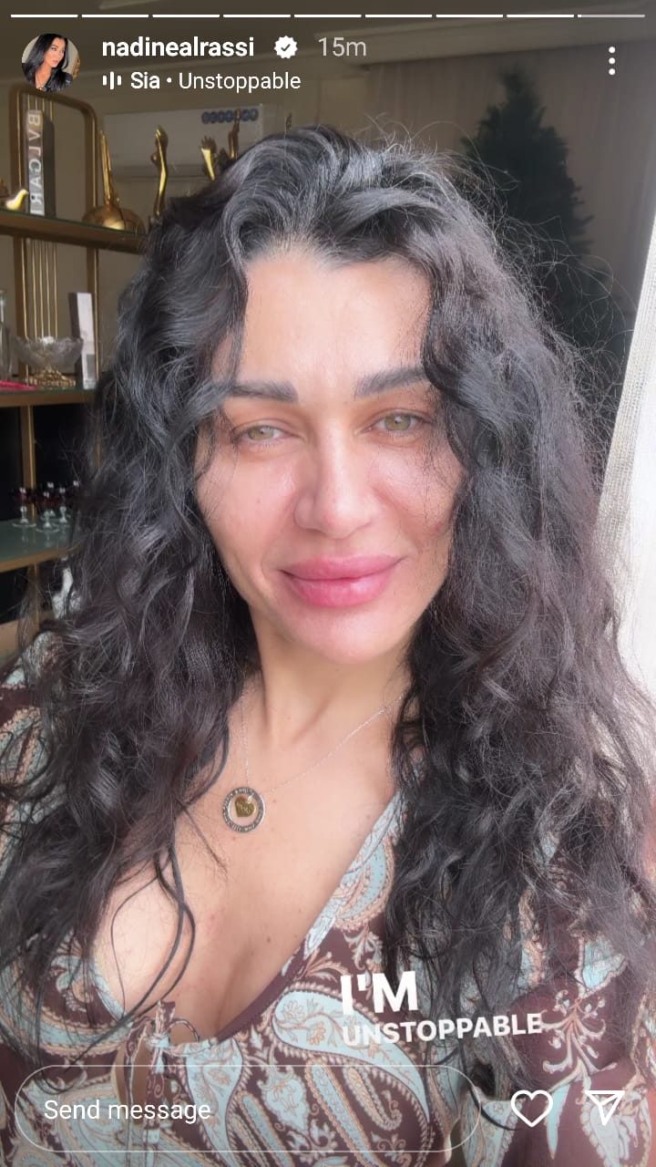 نشرت الممثلة نادين الراسي صورة لها عبر خاصيّة "ستوري" عبر حسابها على "انستغرام".     وظهرت الراسي في الإطلالة الأخيرة من دون "مكياج"، مستعرضة جمالها.     وقال العديد من متابعي الراسي إنّها لا تزال جميلة، وخصوصاً من دون "المكياج".